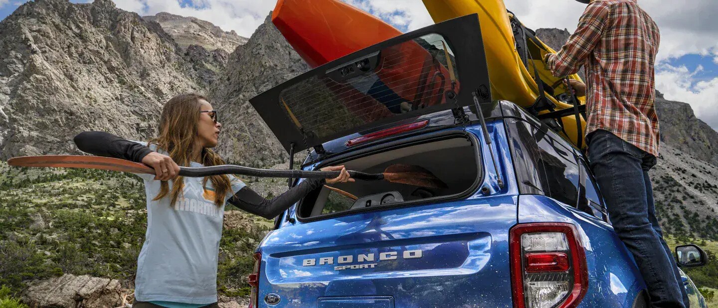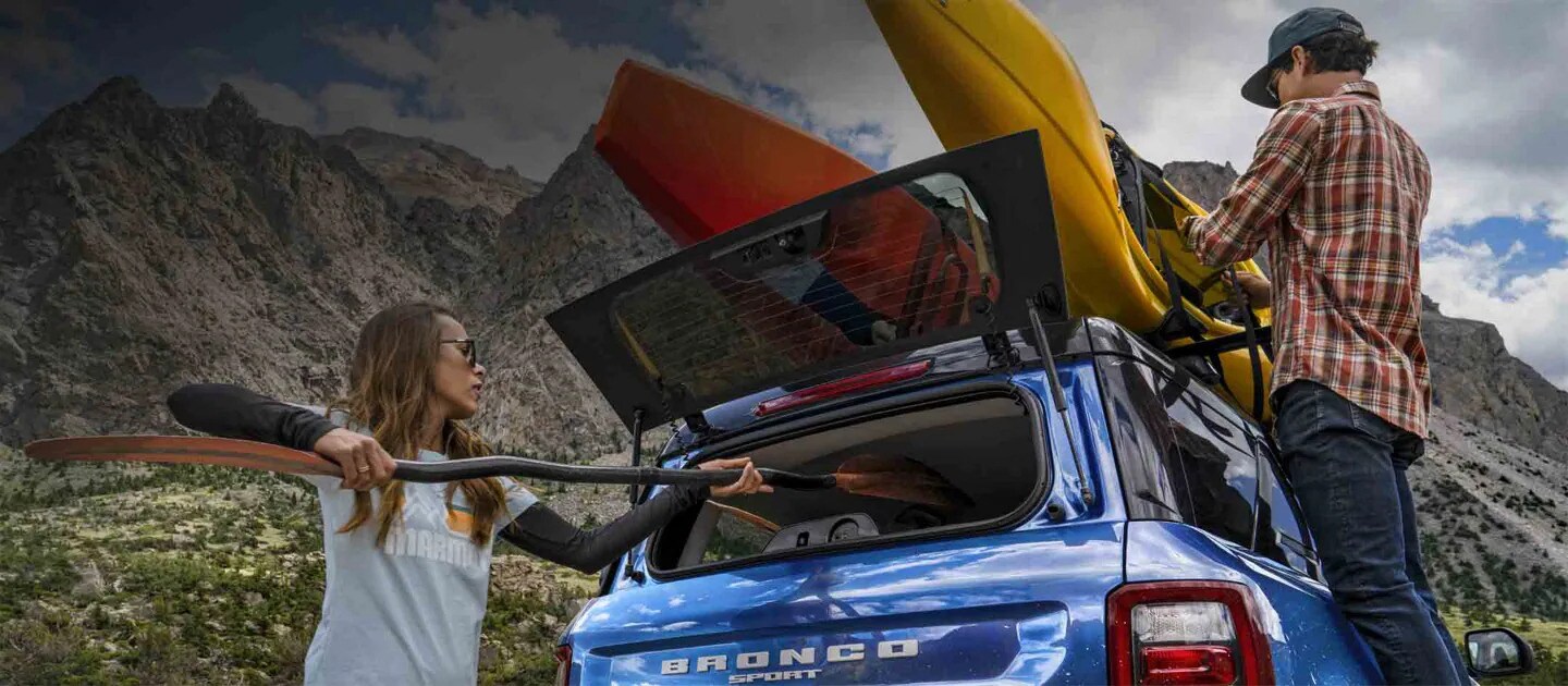 *Cargo and load capacity limited by weight and weight distribution. Optional equipment shown with available Ford Accessories. Recreational equipment not included. Always consult the Owner's Manual before off-road driving, know your terrain and trail difficulty, and use appropriate safety gear. Ford is committed to the preservation of the environment and treading lightly. Learn about the Ford Bronco Wild Fund. Bronco Sport Badlands™ shown. Limited availability. See dealer for available inventory stock.