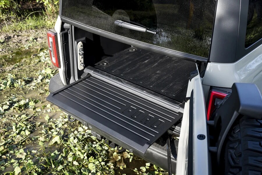New for 2022, the available slide out tailgate adds more versatility to 4-door Ford Bronco models (excluding Badlands™ and Raptor™) with its ability to function as a table, work surface or step to access rooftop cargo. Once you're done, it conveniently stows under the load floor, so you don't have to remove any gear. *