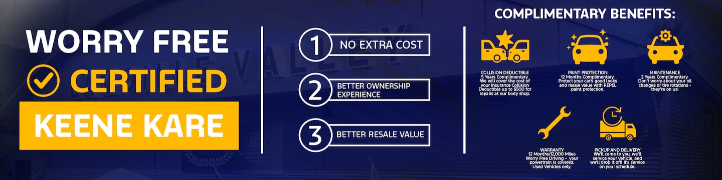 Buying a vehicle is a major life decision, and Lamoille Valley Ford Inc. cares about ensuring your complete satisfaction and that you feel confident no matter which vehicle you choose. That's why we offer Keene Kare, a complimentary package of worry-free protection plans that protect you from the unexpected and ensure the lasting quality of your new or used vehicle. When you purchase a vehicle at our dealership, all the perks of Keene Kare are included with every vehicle to provide exceptional value and peace of mind.